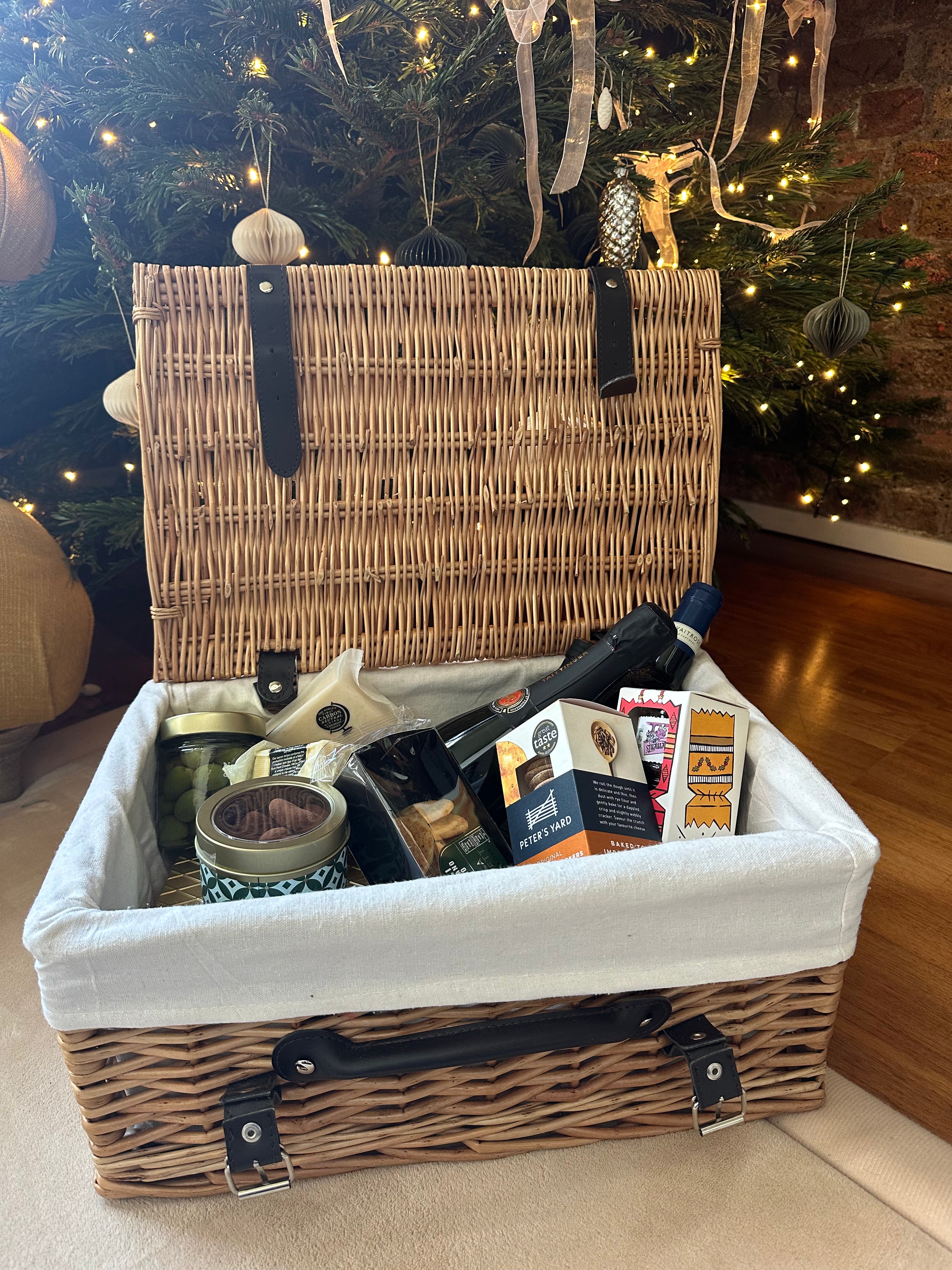 A: Our Basic Hamper (£50) includes Bordeaux Claret Reserve, Sussex Charmer, Ivy's Reserve Vintage Cheddar, homemade jam, and premium Albanian EVOO. The Premium (£120) adds Peter's Yard sourdough crackers and Waitrose No.1 olives. The Luxury Hamper (£200) is our showstopper with Taittinger Brut Réserve champagne, Bordeaux Claret Reserve, three exceptional British cheeses including Black Truffle Hound, Waitrose No.1 chocolate truffles, three Tracklements chutneys, Waitrose No.1 Belgian waffle biscuits, and Angela Hartnett's Parmigiano Reggiano biscotti.